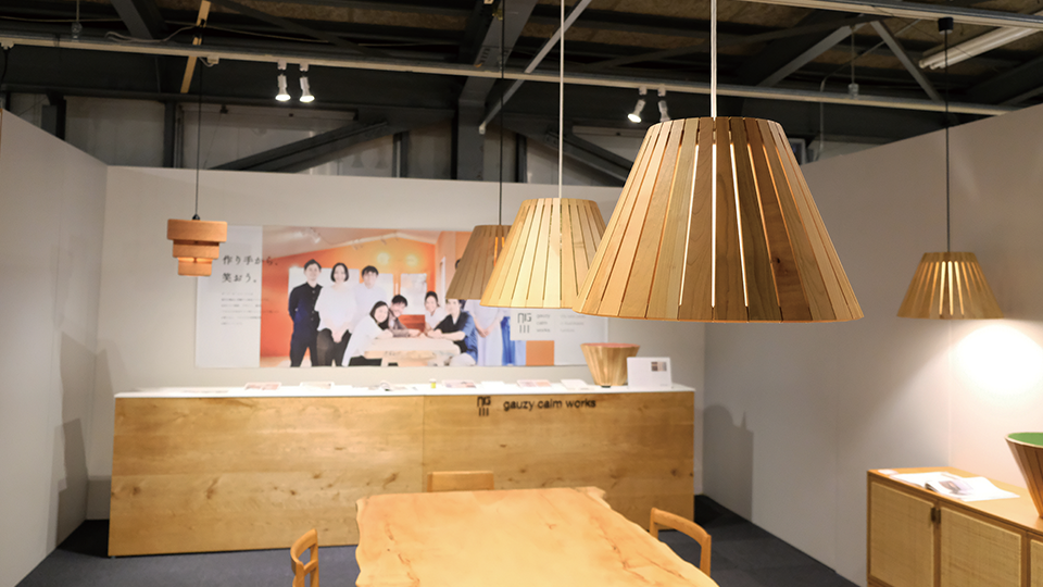 This is the booth of a custom-made furniture brand, “gauzy calm works”, which is run by members in their thirties or younger. Many of the items on display are made by utilizing locally sourced materials and solid wood with knots, like the ones shown here.